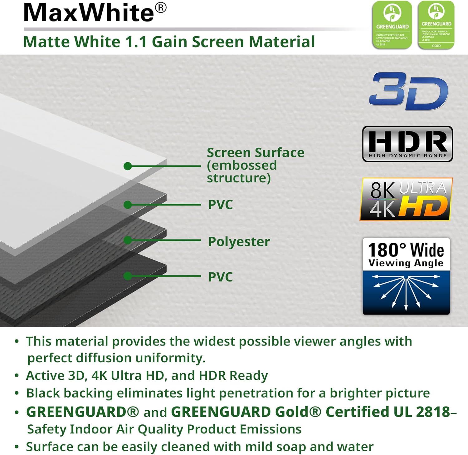- Screen Material: MaxWhite a 1.1 Gain, 4K Ultra HD and Active 3D Ready FRONT Projection Screen with Black Backing. Features a 180Β° viewing angle is easy to Clean and is GREEN GUARD and GREENGUARD GOLD Certified for Safe/Clean Indoor Use. Compatible with Standard UHD/HD projectors. Not compatible w/ Ultra/Short Throw Projectors.