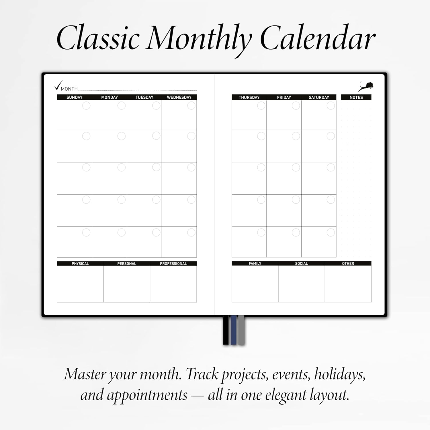 Daily Planner, Calendar & Life Organizer to Improve Time-Management, Productivity & Happiness | Vegan Leather Hardcover Notebook with Blank Dates, Undated 6 Months Hourly Planner for Men & Women, 24 Hour Agenda (Black)