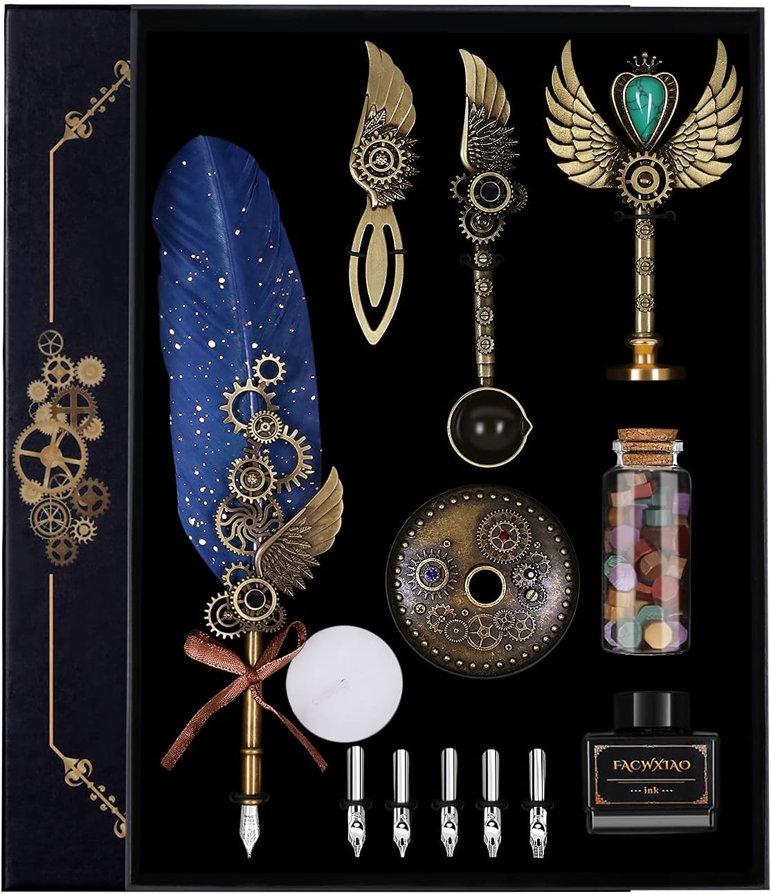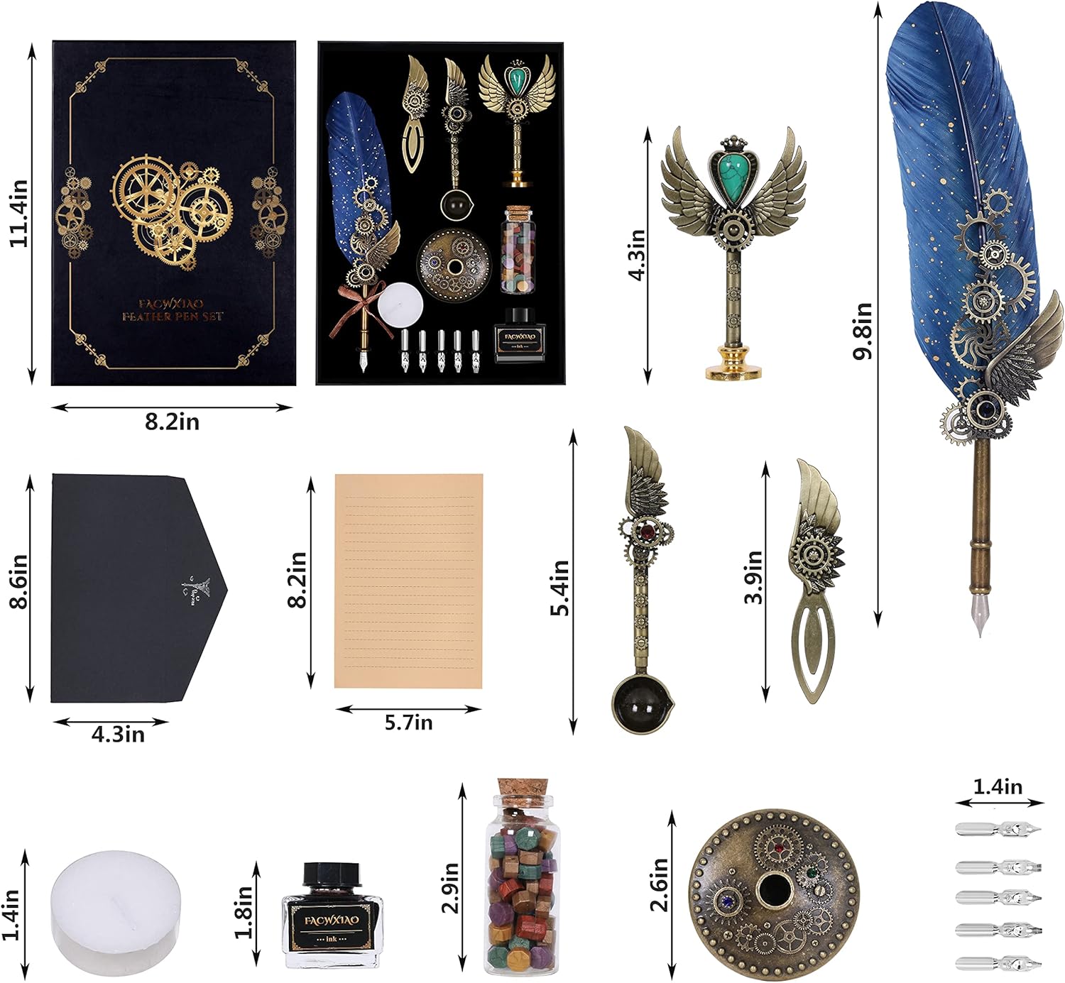 - 【QUILL PEN SET】Quill pen set includes: feather pen, ink ,bookmark ,seal stamp, 5 stainless steel pen nib in different sizes, wax bead, pen nib base, white wax, spoon,envelopes and writing paper(envelope color random), exquisite premium gift box.