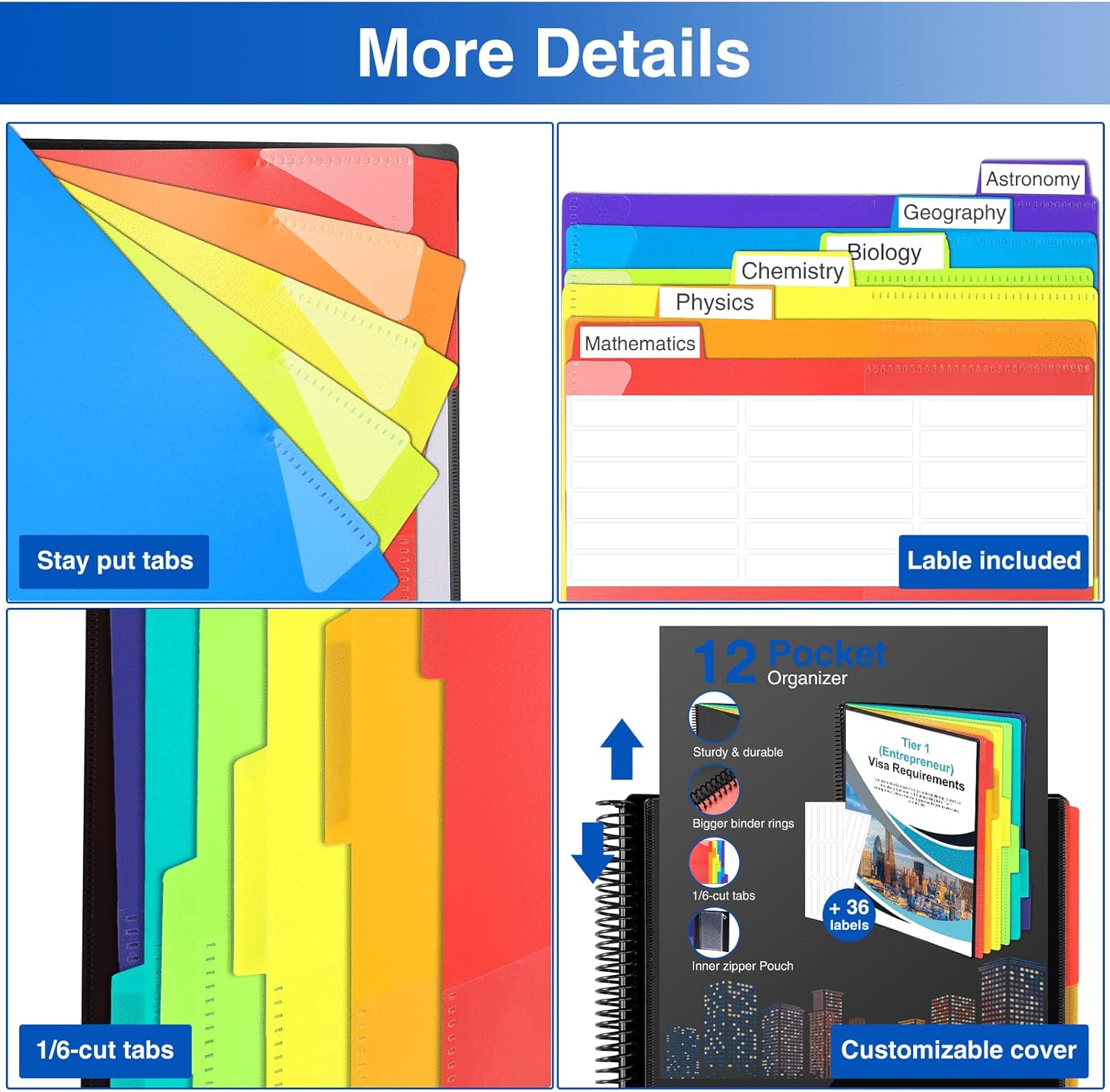 - High-efficiency Paper Organizer: 12 pockets, 6 dividers with 1/6-cut assorted tabs in bright colors, and 36 blank viewable sticky labels. Super handy for quick referencing. Perfect for categorizing and organizing projects, homework, assignments, or other important documents.