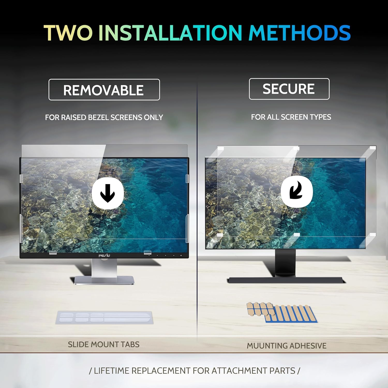 - 【2 MOUNTING OPTIONS FOR EASY INSTALLATION】The Peslv 22 inch privacy screen for monitor supply 2 installation options, Various installation options, are Compatible with both 22" computer monitors with raised bezels and full-screen 22" computer monitors without raised bezels, and convenient installation allows you to complete the installation in 9 seconds. NOTE: Monitors without raised bezels are only available with mounting option 2.