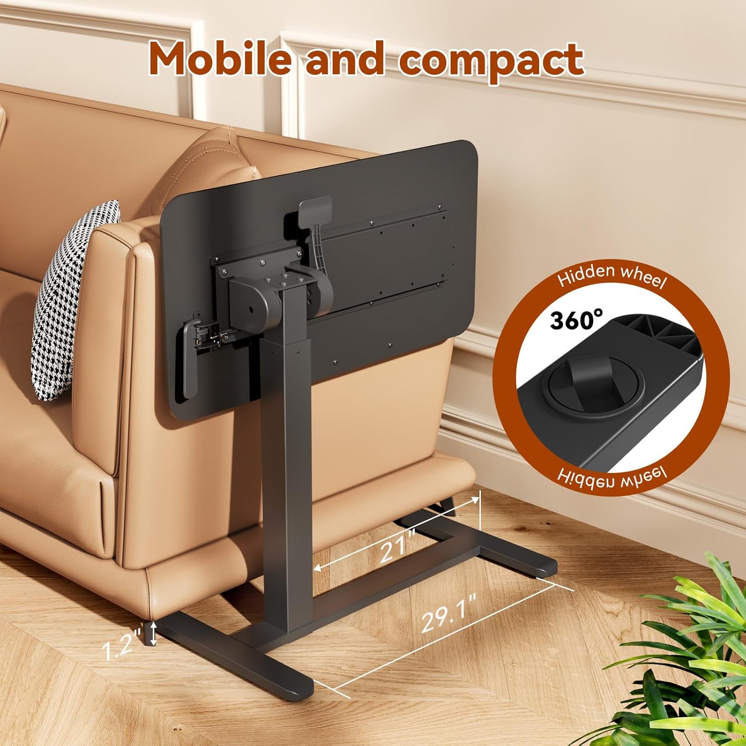 - 2 Types of Casters Included: Our mobile standing desk comes with 4 lockable casters, enhancing maneuverability on carpets. And the low-profile base features hidden wheels that tuck neatly under furniture at a minimum height of just 1.2", maximizing valuable space