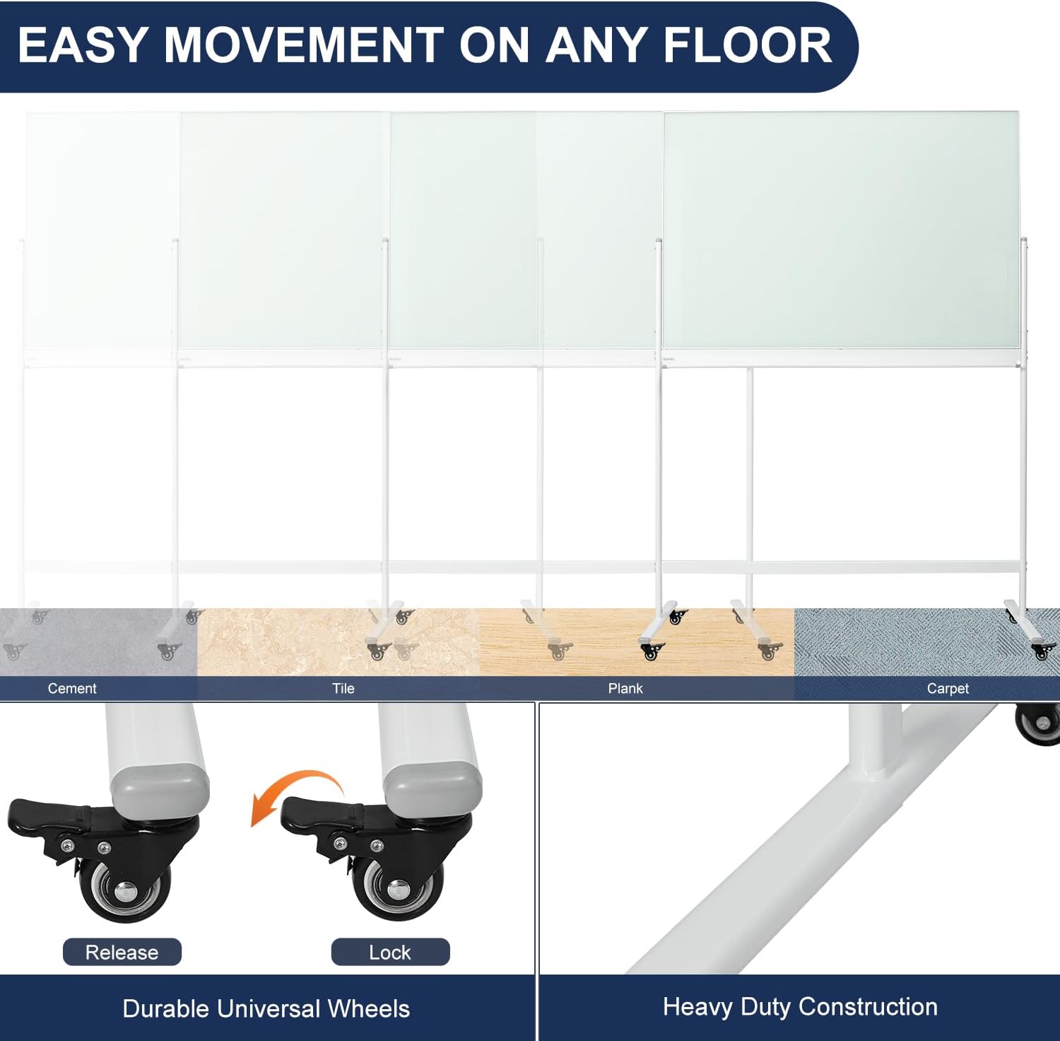 - 360Β° ROTATED & LOCKABLE - The magnetic mobile dry erase board comes with 4 sturdy universal wheels that support 360-degree rotation, allowing you to move easily whether on hard floors or carpets. Each wheel has a locking system to keep it stable while writing and wiping.