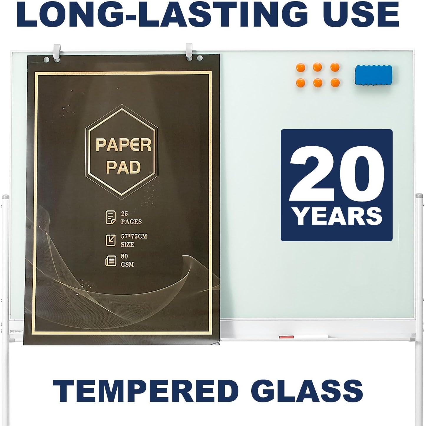 - CONTAINS EVERYTHING YOU NEED - This large magnetic whiteboard kit includes a mobile clear tempered glass board, 25 sheets of paper pad, 6 magnets, 2 flip chart hooks, 3 markers and 1 magnetic eraser. It comes with everything you need. Enjoy the standing whiteboard as soon as you receive it!