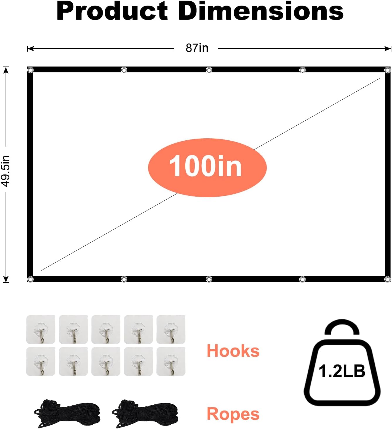 TOWOND Projector Screen 100 inch Projection Screen Indoor Outdoor Washable Anti-Crease 16:9 HD Rear Front Movies Screen for Home Theater Office