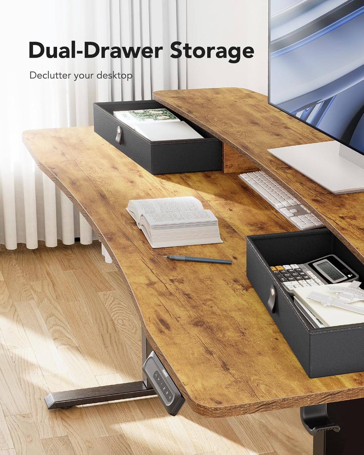 - Efficient Desktop Organization: The electric standing desk maximizes organization with two desktop drawers to store items out of sight and an open storage cubicle for your keyboard, mouse, and other accessories. With a spacious 55″ desktop, you also have plenty of room to display your favorite decorations and collectibles.