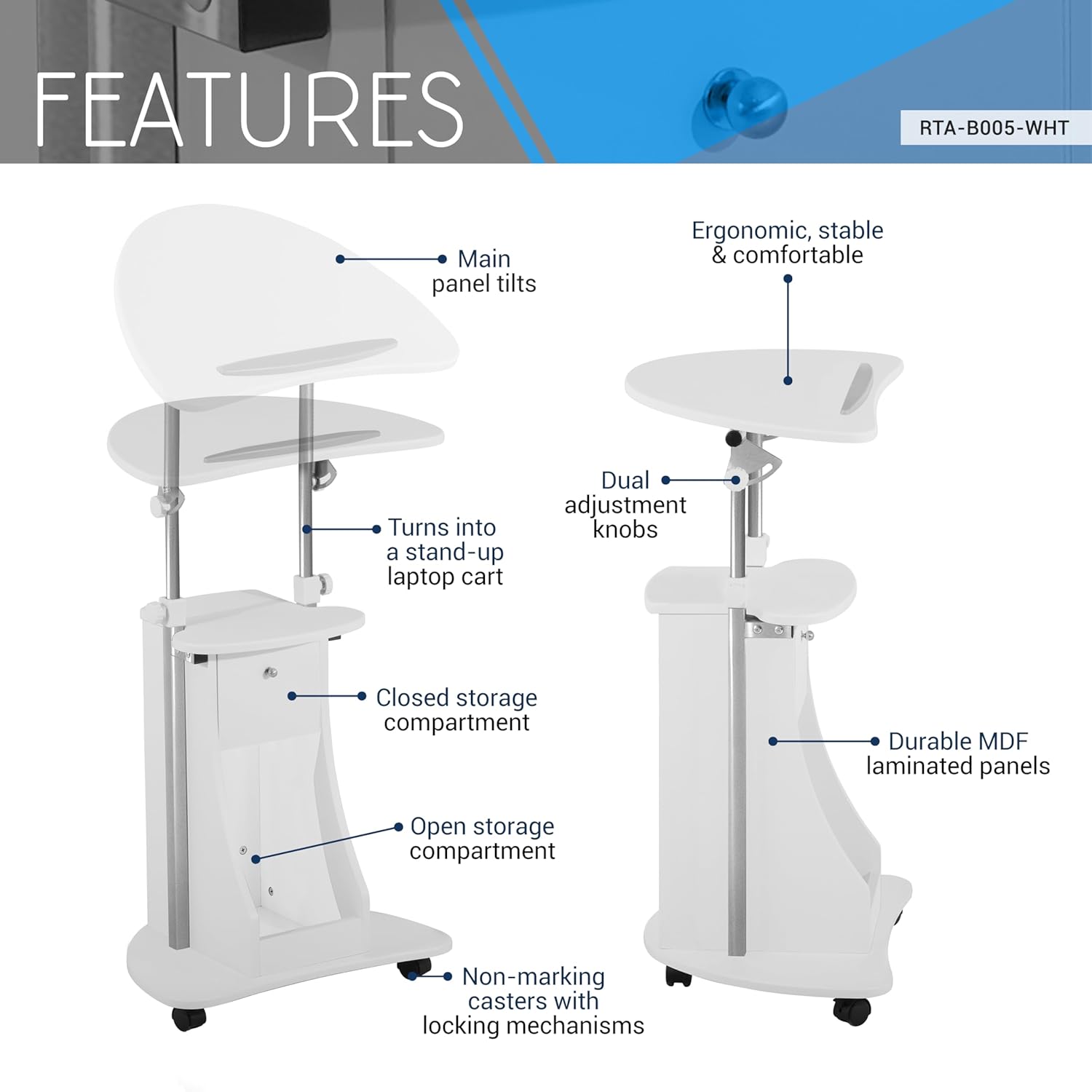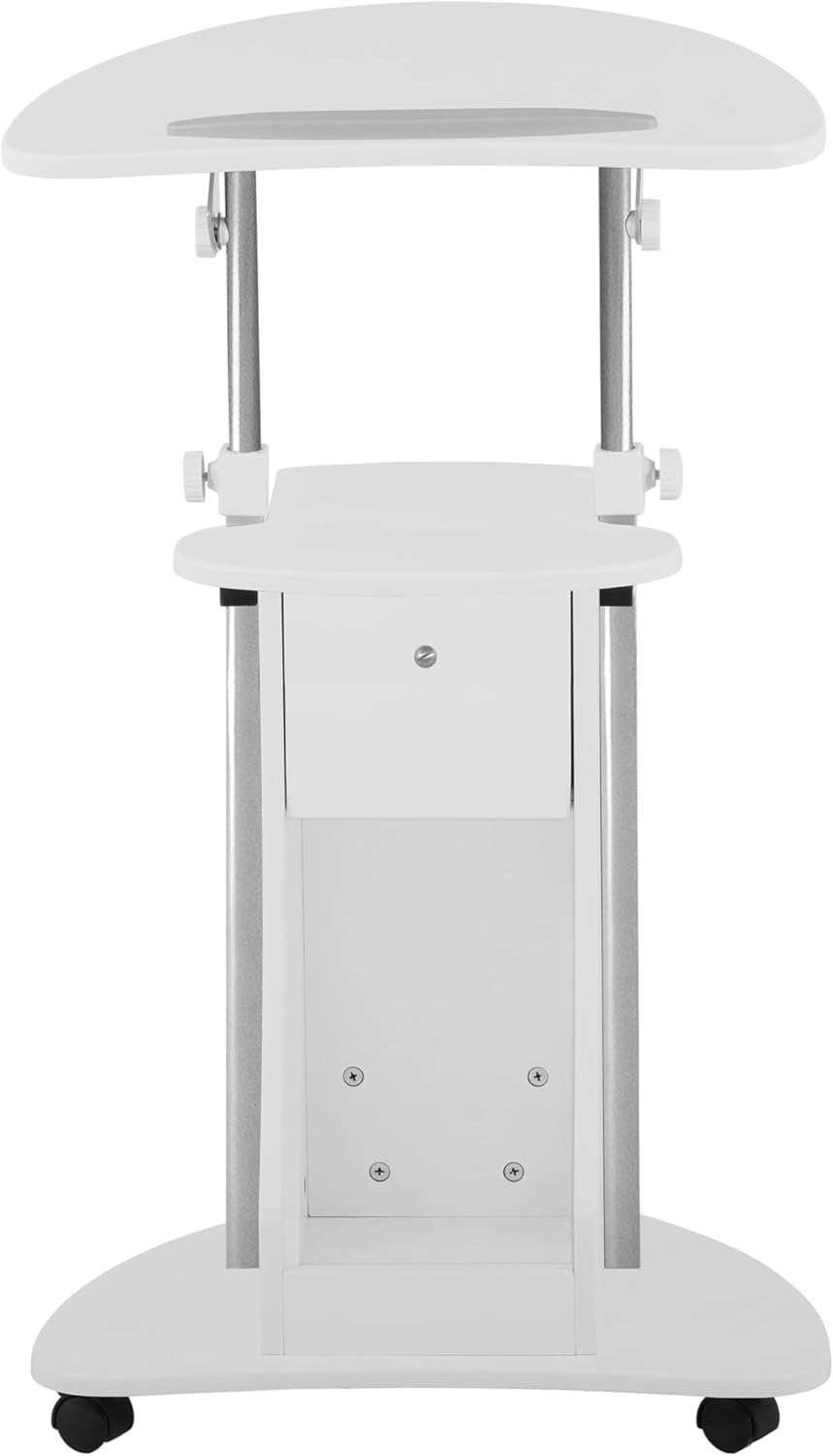 Techni Mobili Adjustable Height Rolling Laptop Cart with Storage, Sit to Stand Desk with Wheels, Podium Stand or Medical Cart, White