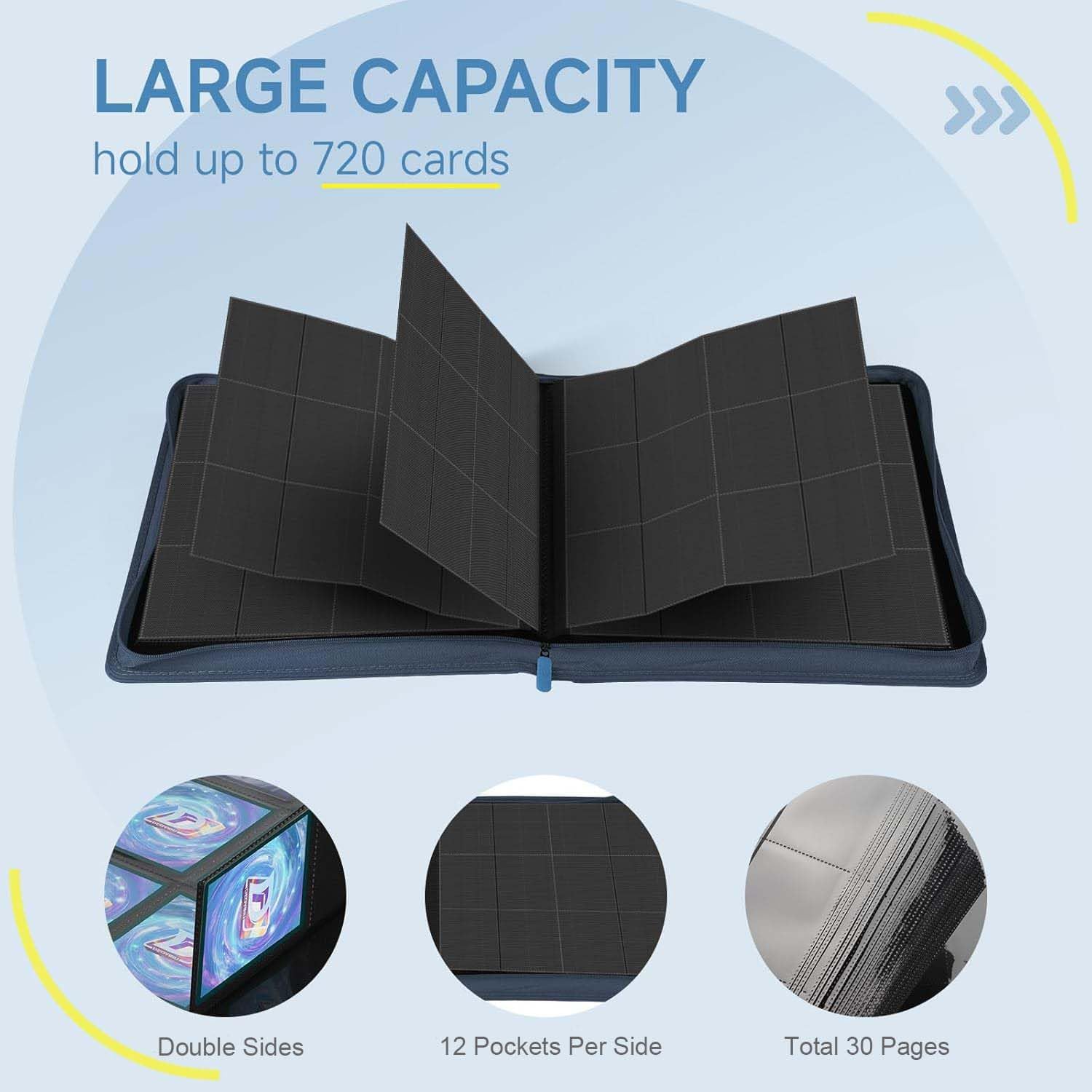Trading Card Binder with Zip,12 Pockets Card Binder,720 Double Sided Pocket Card Collection Binder,Card Album Card Folder for MTG,TCG,Sports Cards,Game Cards,Navy Blue