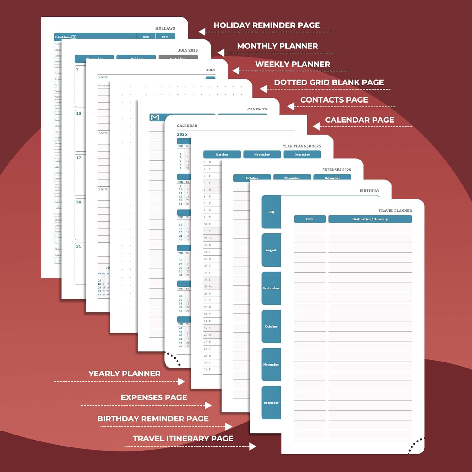 - Life Personalized System: Weekly plan, Monthly & year planner pages, holiday reminders throughout the year, birthday record area for relatives and friends; set up record inspiration and plans with the dot matrix note area; at the same time, weekly planner provides travel planning and bill expense management