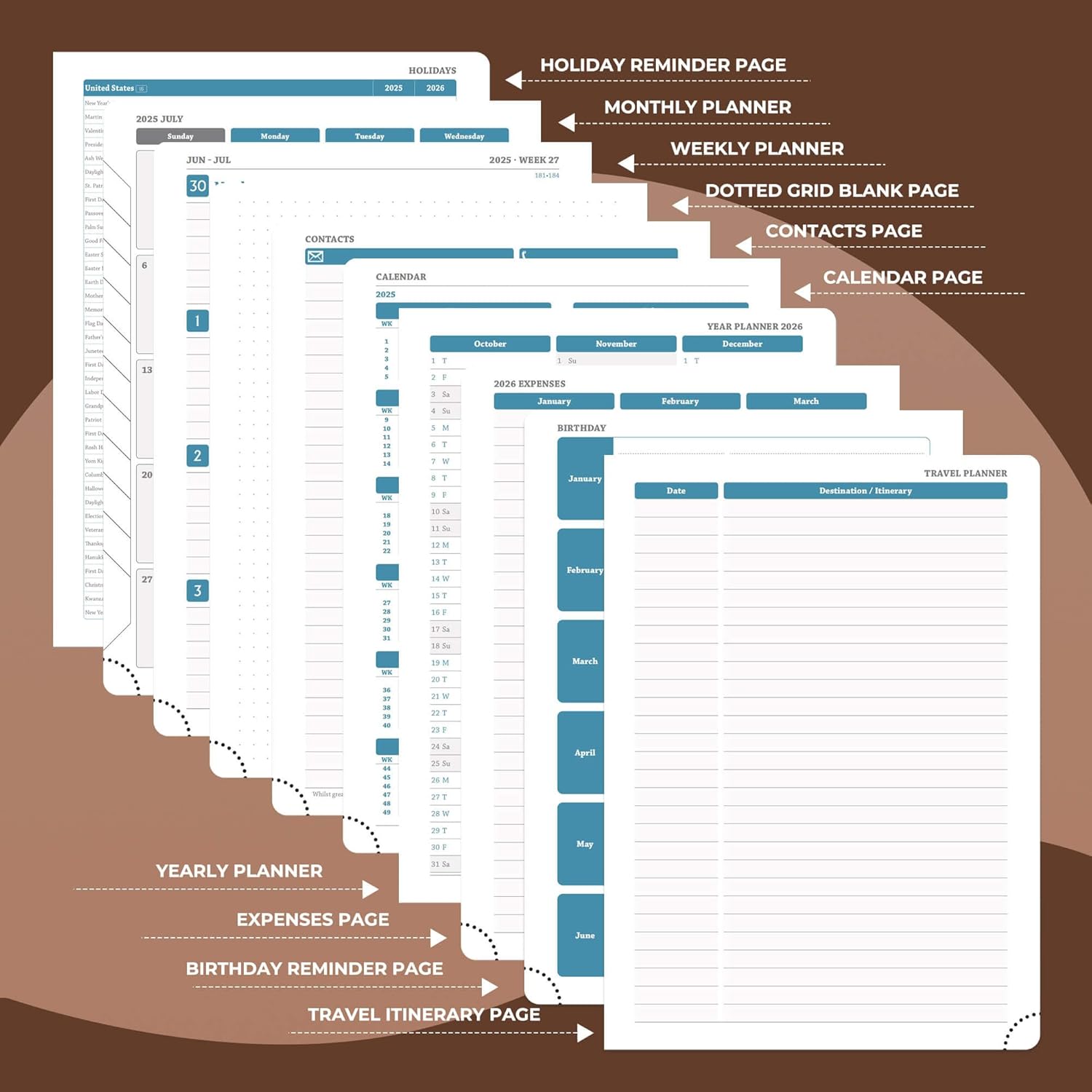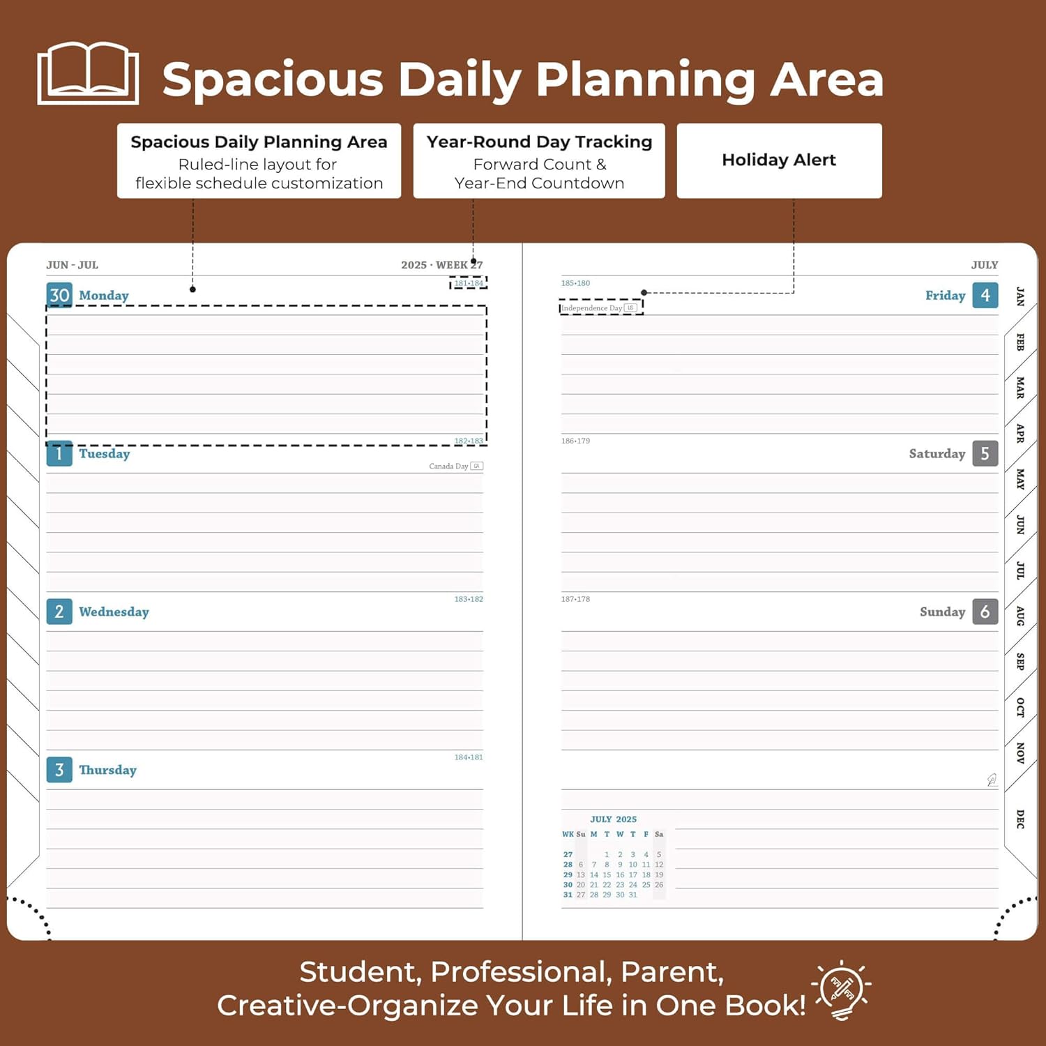 - Monthly Planner: Covers July.2025-Dec.2026. It adopts a double-page design for one week, so you can get a general overview without turning pages. The weekly planner page provides writing space for arrangement of daily tasks, priority management and activity records; the left side of the monthly plan marks important dates, and the right side plans special tasks