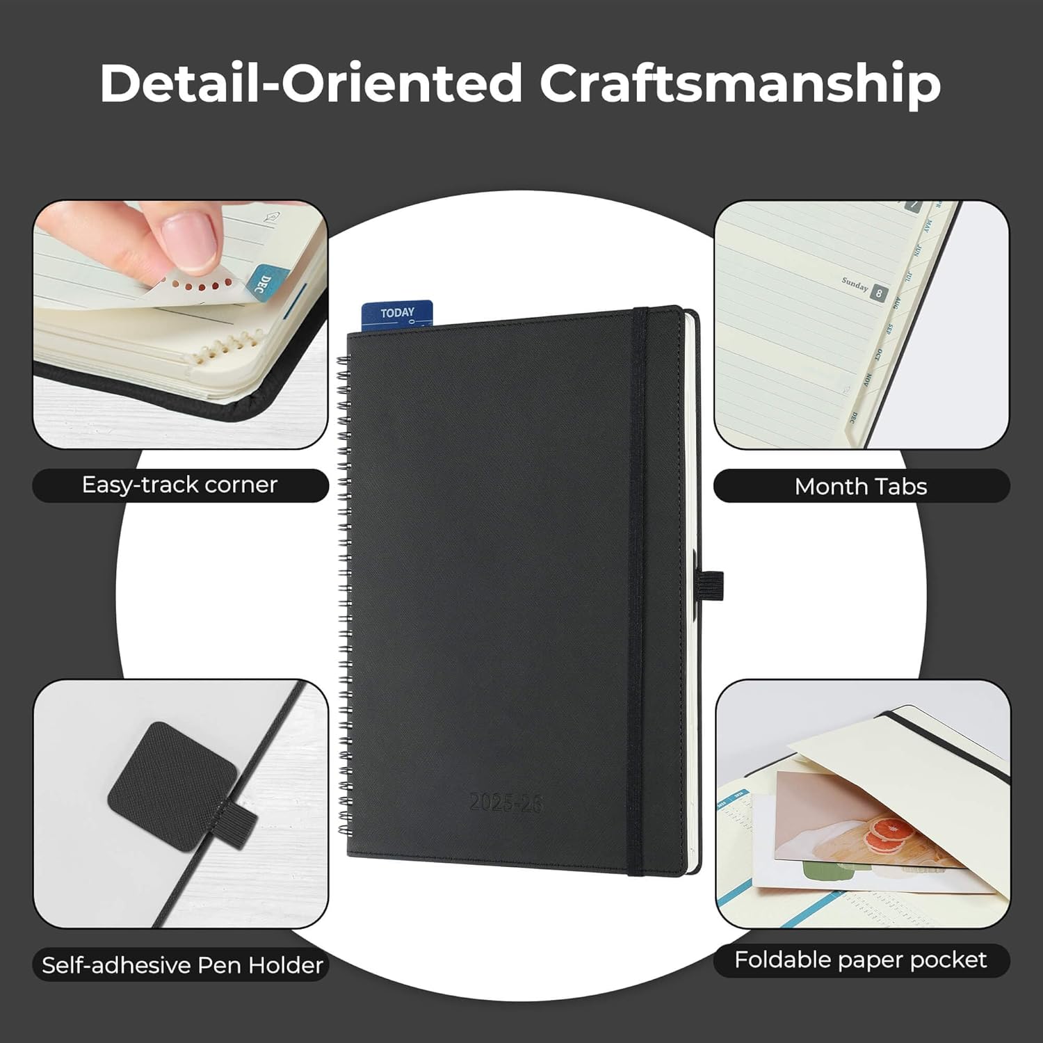 Planner 2025-2026 Daily Weekly and Monthly,11.5"x8.5",18 Months Spiral Bound Calendar Agenda with Self-adhesive Pen Holder,2026 Academic Plan with Vegan Leather Soft Cover,Black