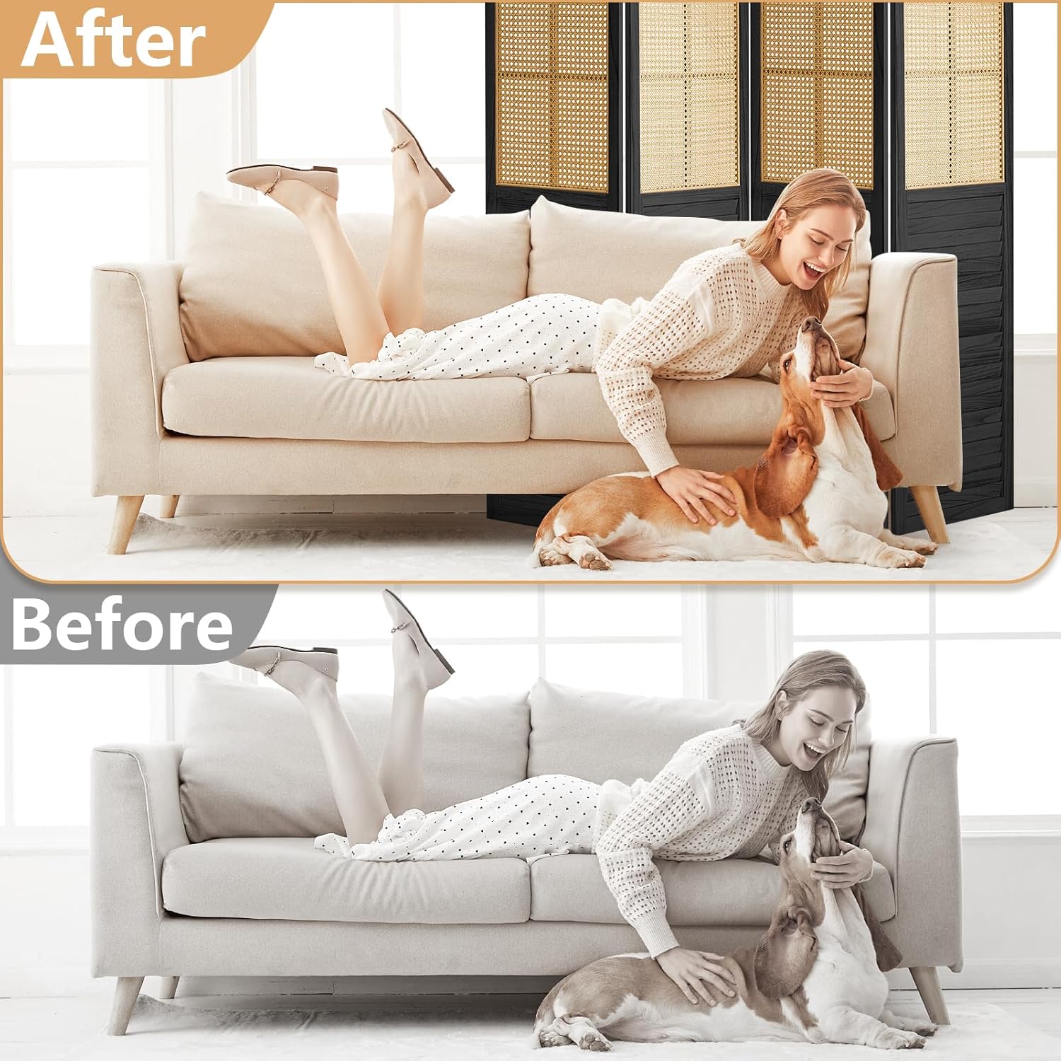 - Window Shape Design & Rattan Craftsmanship: The upper part of the rattan room divider is designed in the shape of a classic european window, with exquisite rattan craftsmanship, showing an elegant artistic flavor. Rattan not only gives the room divider a unique texture and feel, but also enhances the overall air permeability and lightness, which is suitable for creating a cozy and natural home atmosphere, making it the highlight of home decoration.