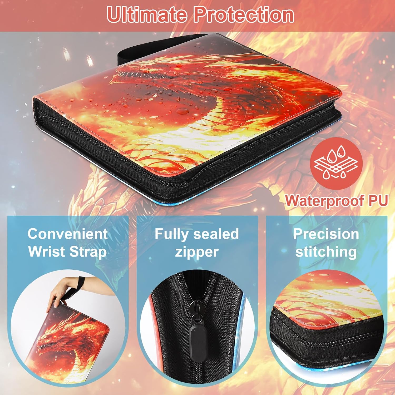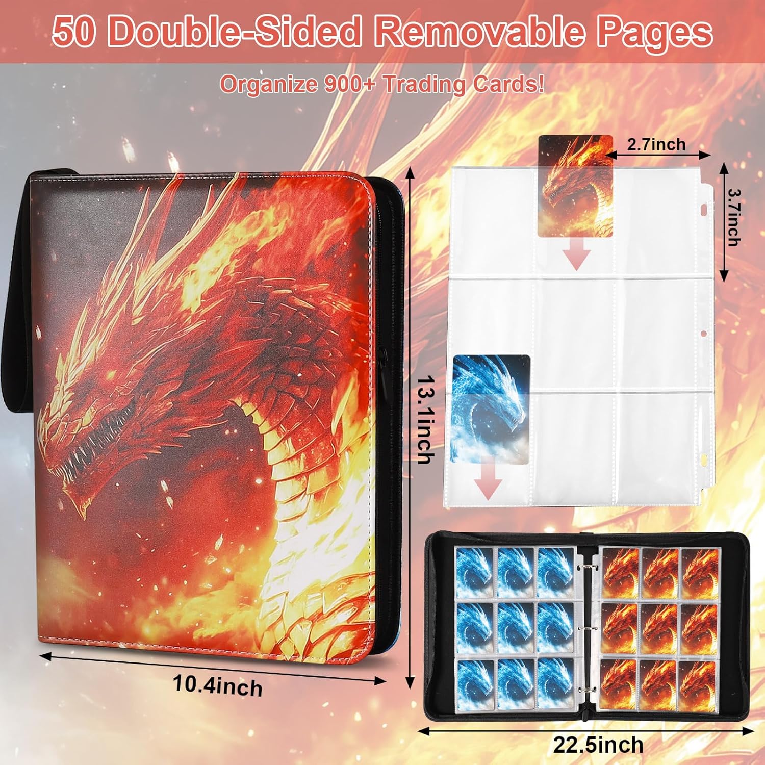 Fire & Ice Dragon 9 Pocket Trading Card Binder Album, Holds 900 Cards with 50 Removable Double-Sided Sleeves, Waterproof PU Leather Zipper Binder for TCG, MTG, Sports Cards
