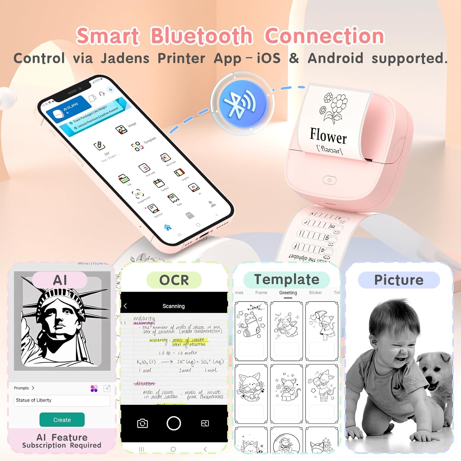 - Smart App Control - Easily connect to your iOS or Android device through Bluetooth using the Jadens Printer App. The app provides a rich set of features: document and photo printing, QR code and chart generation, OCR text recognition, drag-to-resize editing, DIY drawings, AI-assisted image printing, and an extensive library of templates.