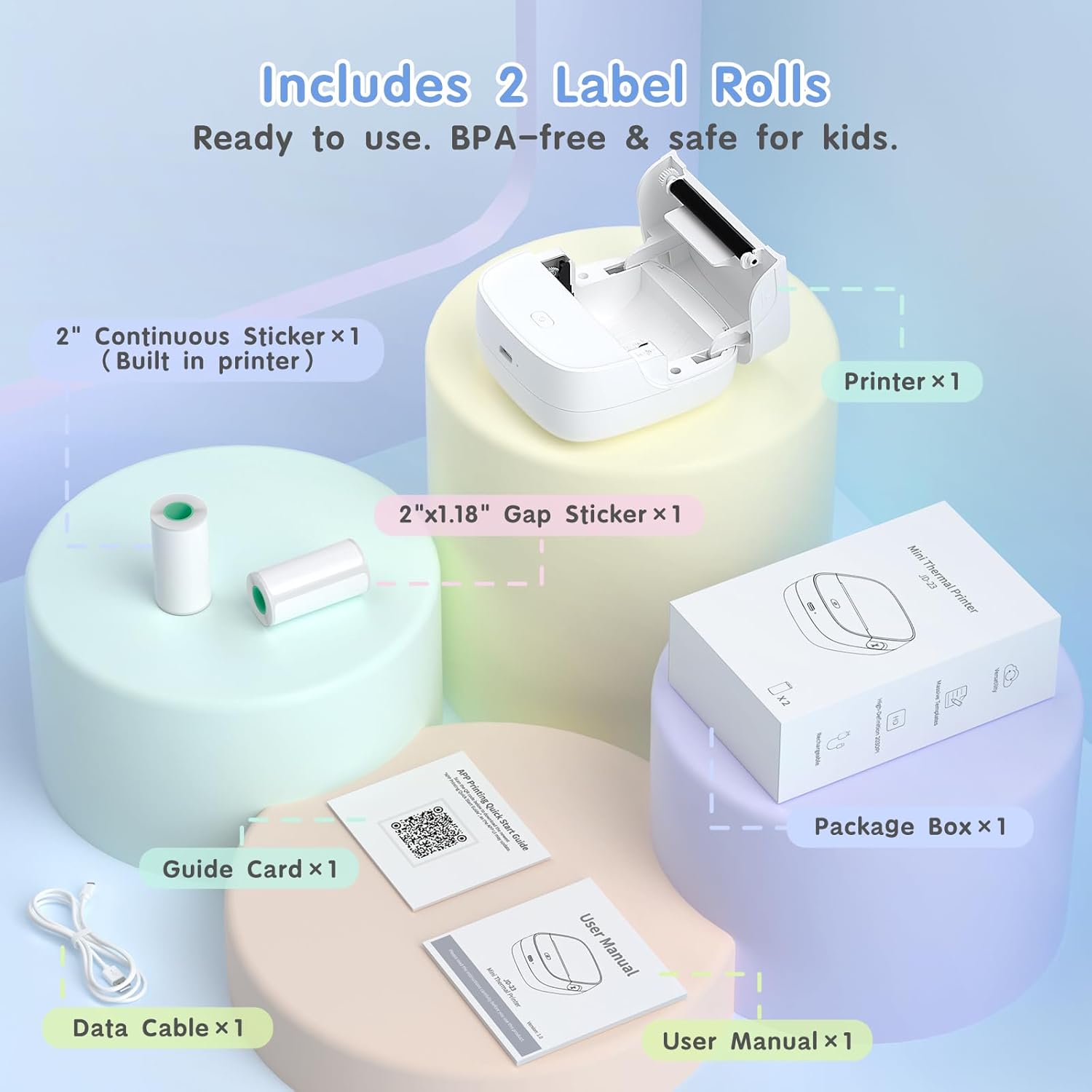 - Thoughtful Gift Choice with Starter Rolls - The package includes two thermal rolls: one 50×30mm label roll (great for QR codes, address tags) and one 50mm continuous adhesive sticker roll. A built-in serrated cutter ensures neat, easy tearing. With its toy-like yet practical design, this mini printer makes a unique and useful gift for students, teachers, kids, planners, and creative individuals—perfect for holidays, birthdays, or back-to-school season.