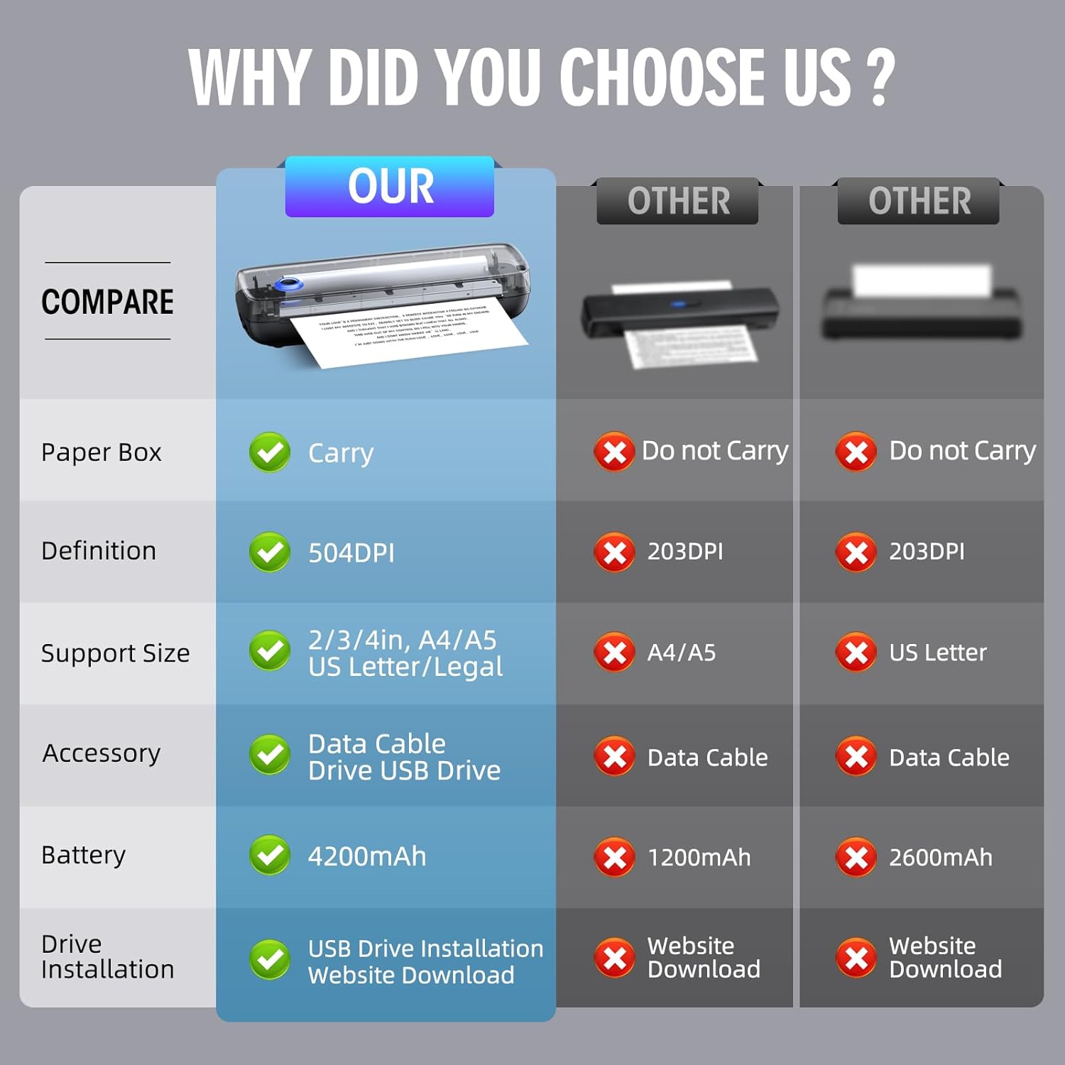 - Ultra-Portable & Lightweight Design Portable Printer – Weighing only 826g (1.82 lbs), this compact printer fits easily in your bag for work, travel, or home use. Enjoy on-the-go printing anytime, anywhere.