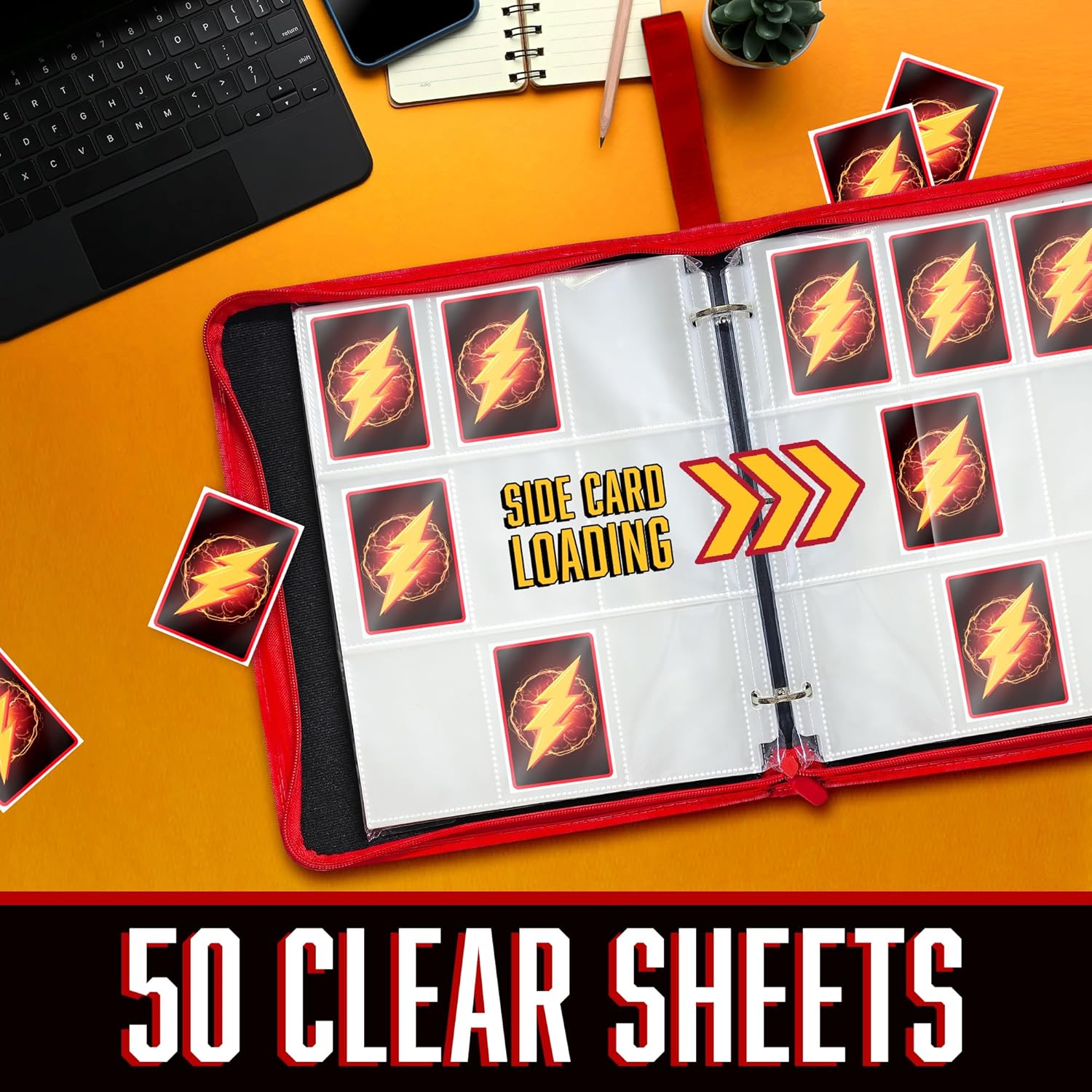 Trading Card Binder with Zipper and Handle – 9-Pocket Double-Sided Card Holder for 900 Cards – PU Leather Cover, 3-Ring Design, Includes 50 Sheets – Fits Standard Size Cards