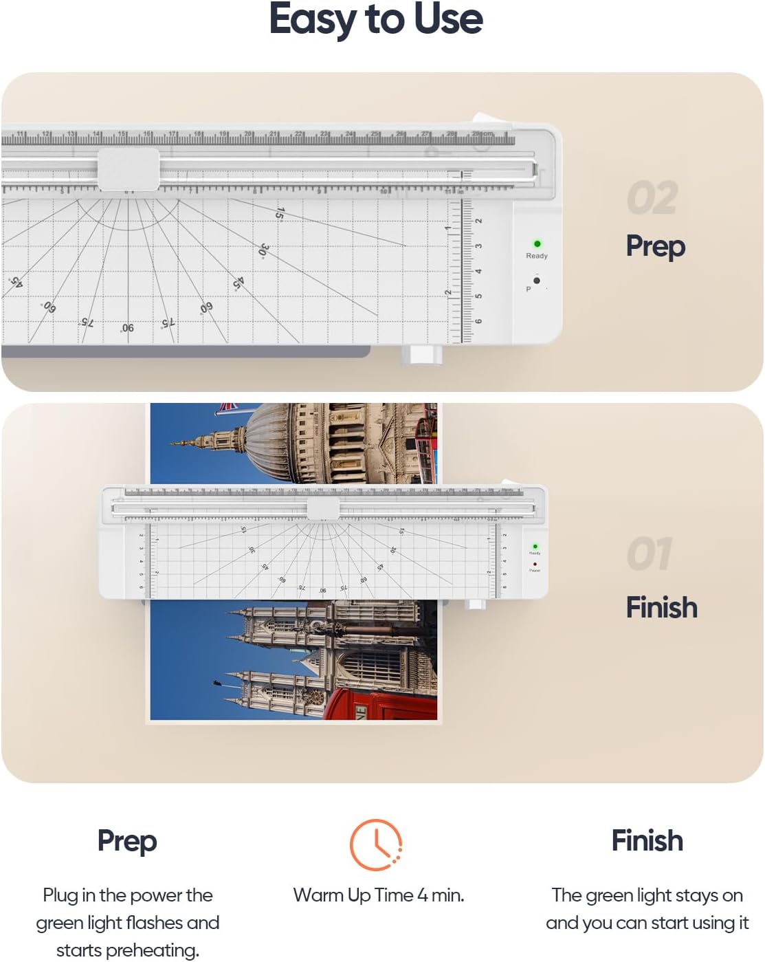 - 【Quick 4-Minute Warm-Up & Fast Lamination】 Start laminating in just 4 minutes! With a speed of 300mm/min, you can laminate multiple pages quickly and efficiently, saving time during busy work or schooldays.