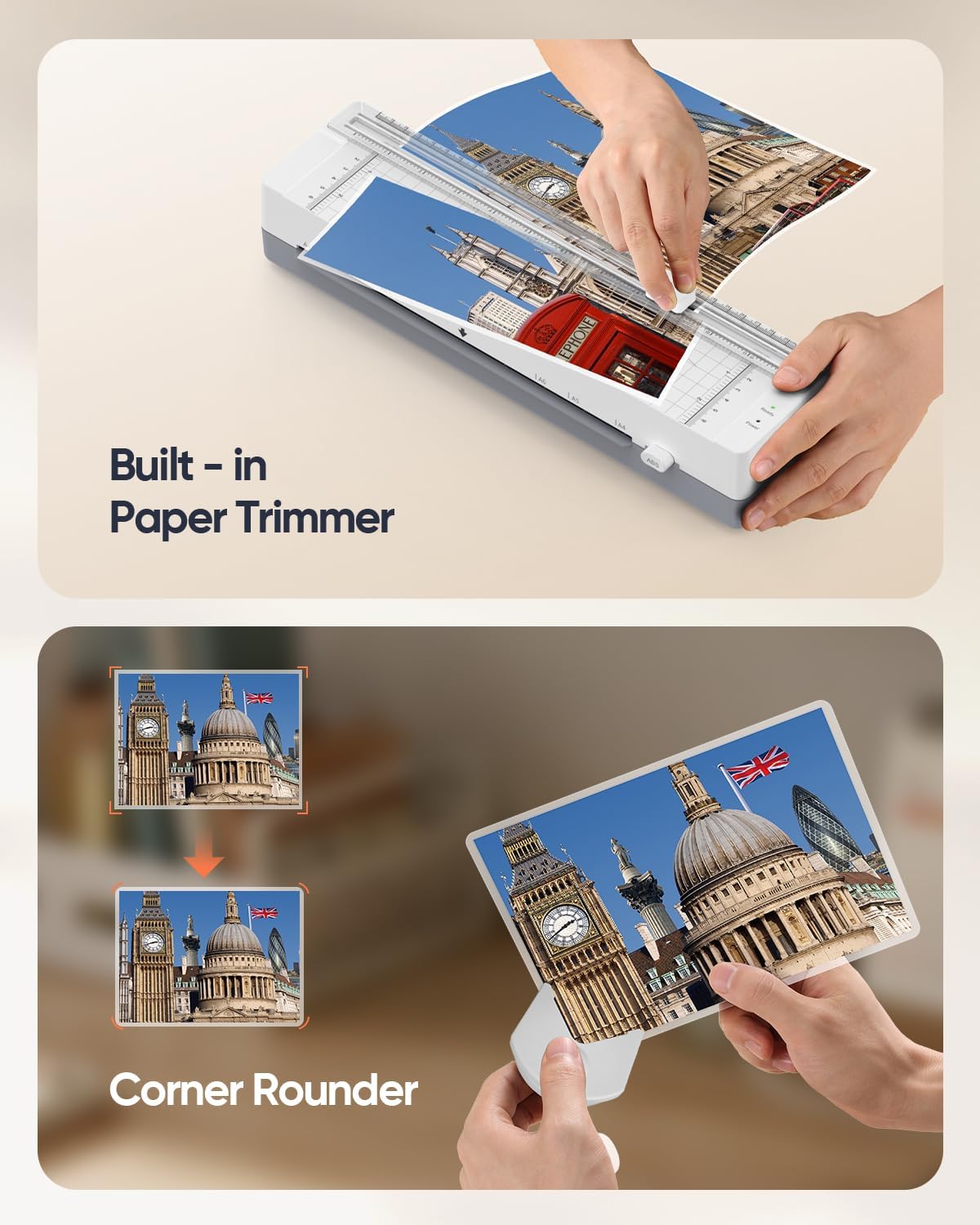- 【3-in-1 Laminating Tool】 This all-in-one laminator machine includes a built-in paper trimmer and a corner rounder, giving you smooth edges and clean cuts without extra tools — perfect for crafts, documents, and school projects.