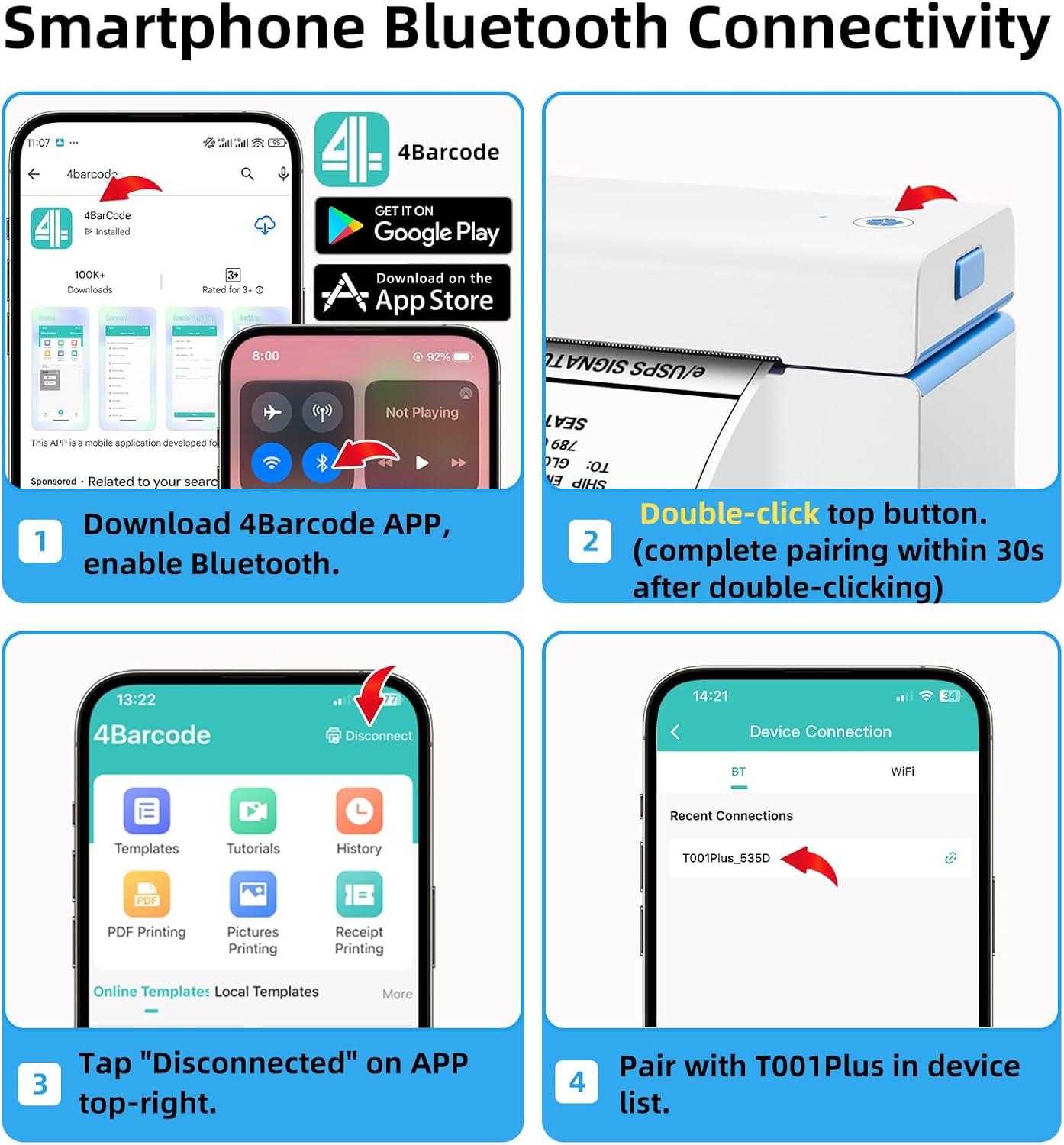 - Go Wireless with Bluetooth: The ORGSTA T001-Plus shipping label printer supports seamless Bluetooth connectivity for both phone and PC printing. For iOS and Android devices, simply download the "4Barcode" app to print wirelessly; Note: Must connect through the "4Barcode" app and cannot pair directly via Bluetooth settings; Windows, Mac OS, Chrome OS, and Linux users can enjoy wireless printing via the included Bluetooth dongle