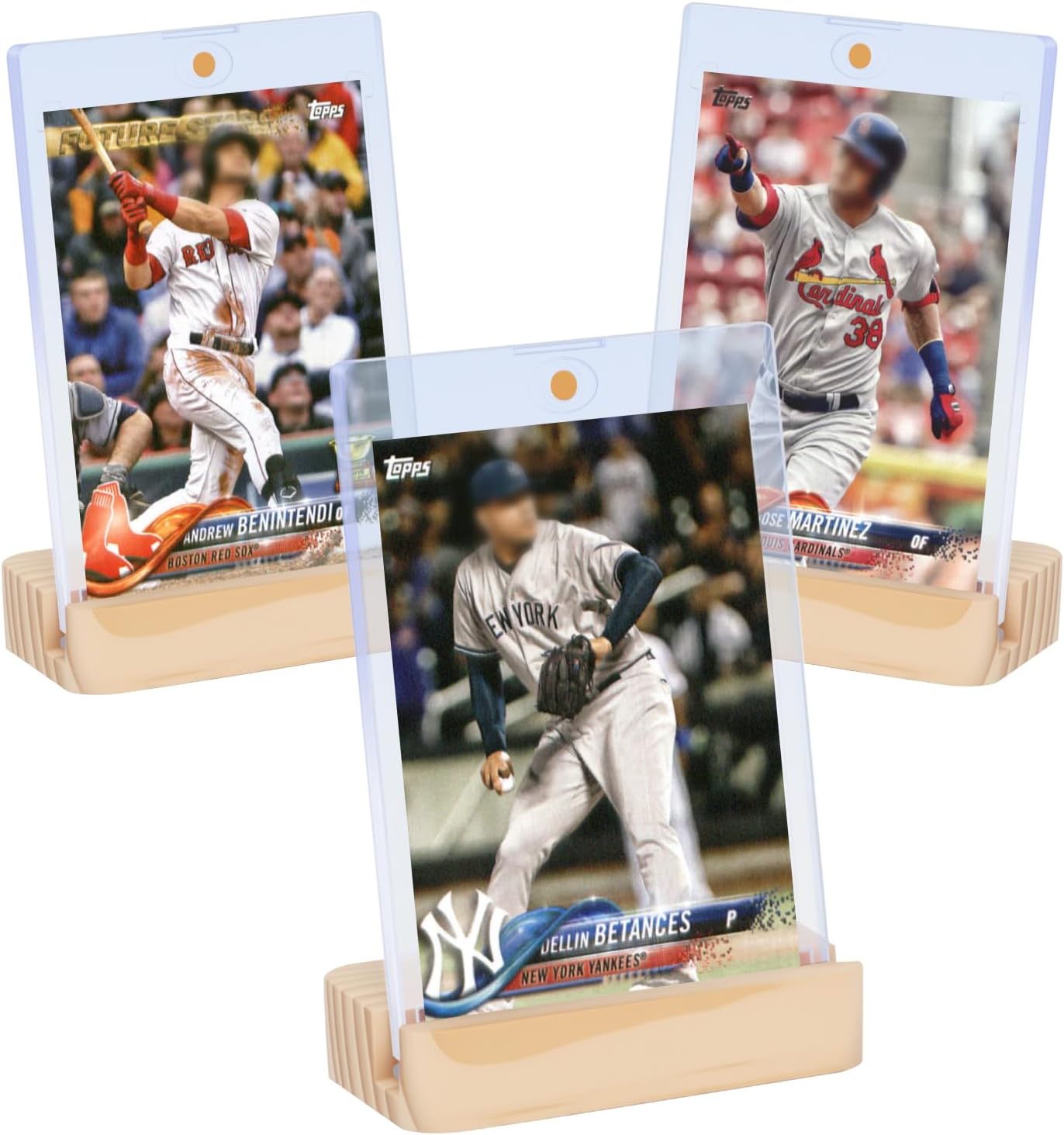 - Card Holder & Wooden Stand Combo: This package includes 3 magnetic card holders and 3 wooden card stands. Providing secure storage while letting you showcase your cards on any desk. Note: Trading cards not included