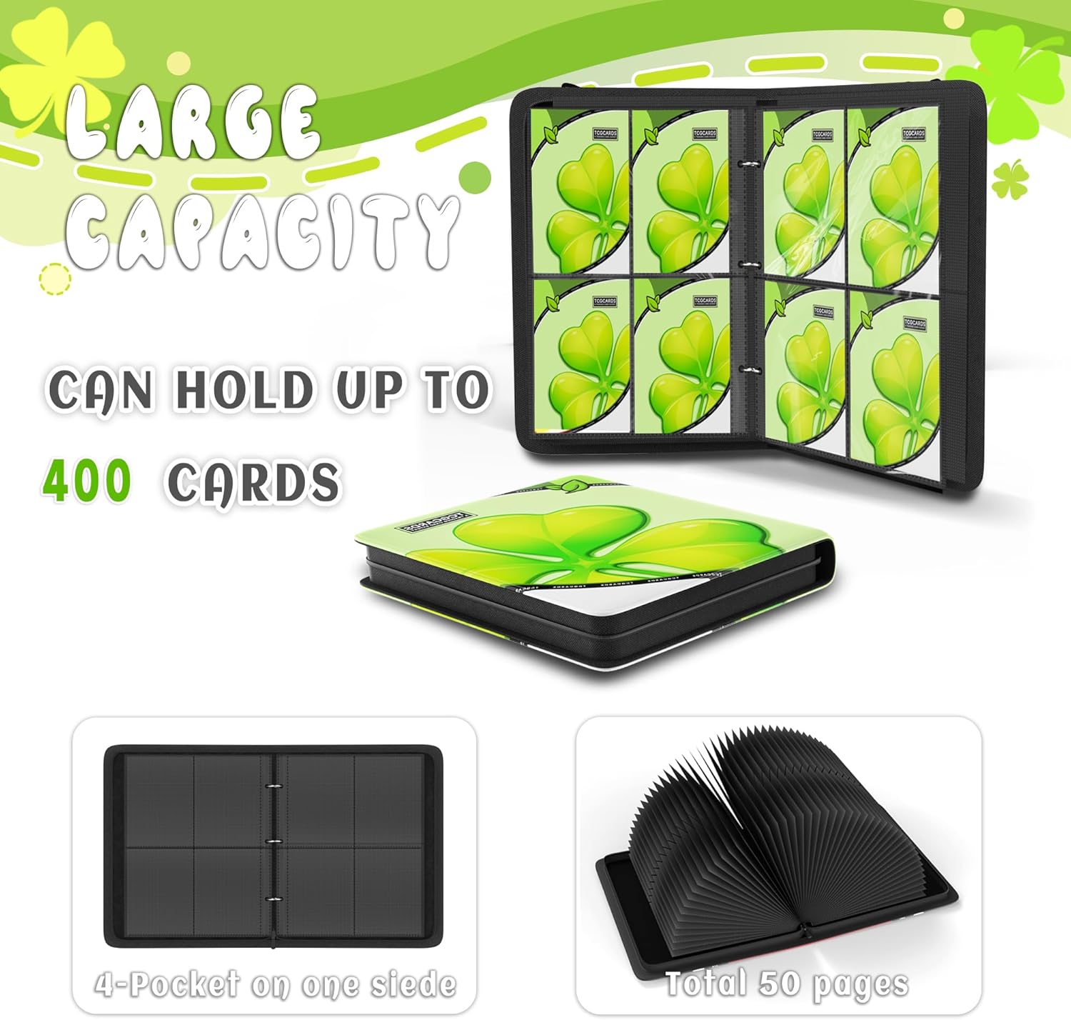 - 🍀【Large Storage Capacity】Boasting 4 generously sized pockets,this trading card binder can house up to 400 cards(courtesy of 50 removable sleeves,each accommodating 8 cards).Whether you've got a vast card collection or love switching things up,this binder has got you covered.The innovative 3-ring design allows for effortless addition or removal of sleeves,giving you the flexibility to organize your cards just the way you want